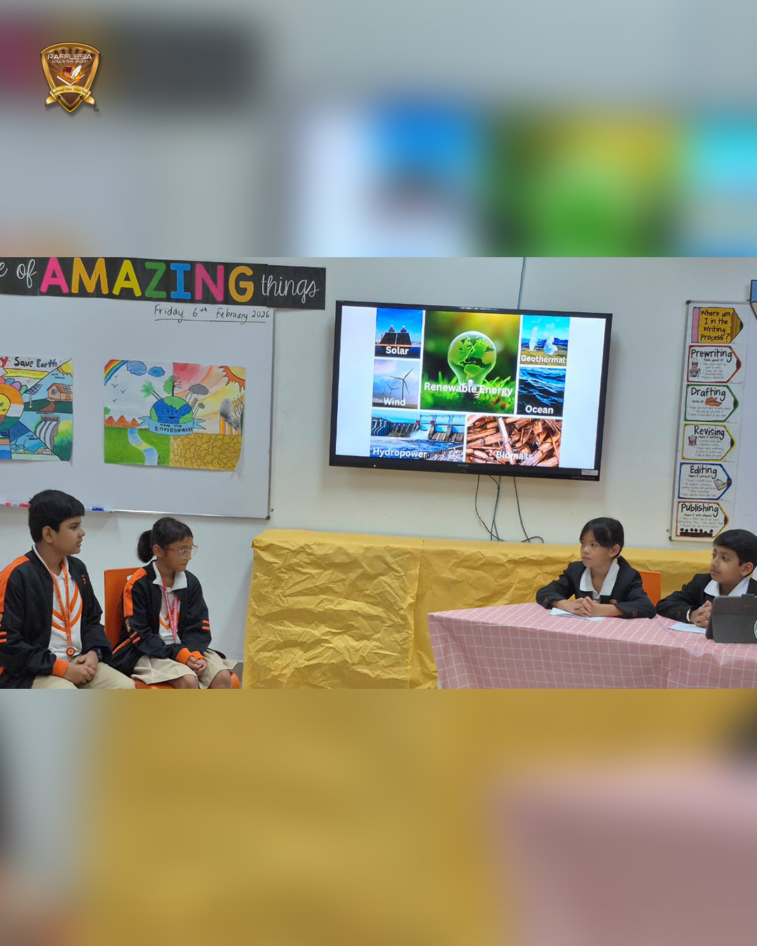 Year 5 students hosted a fun talk show, interviewing “climate experts” on fossil fuels, renewable energy, global warming, endangered animals, the Sustainable Development Goals, and climate action.