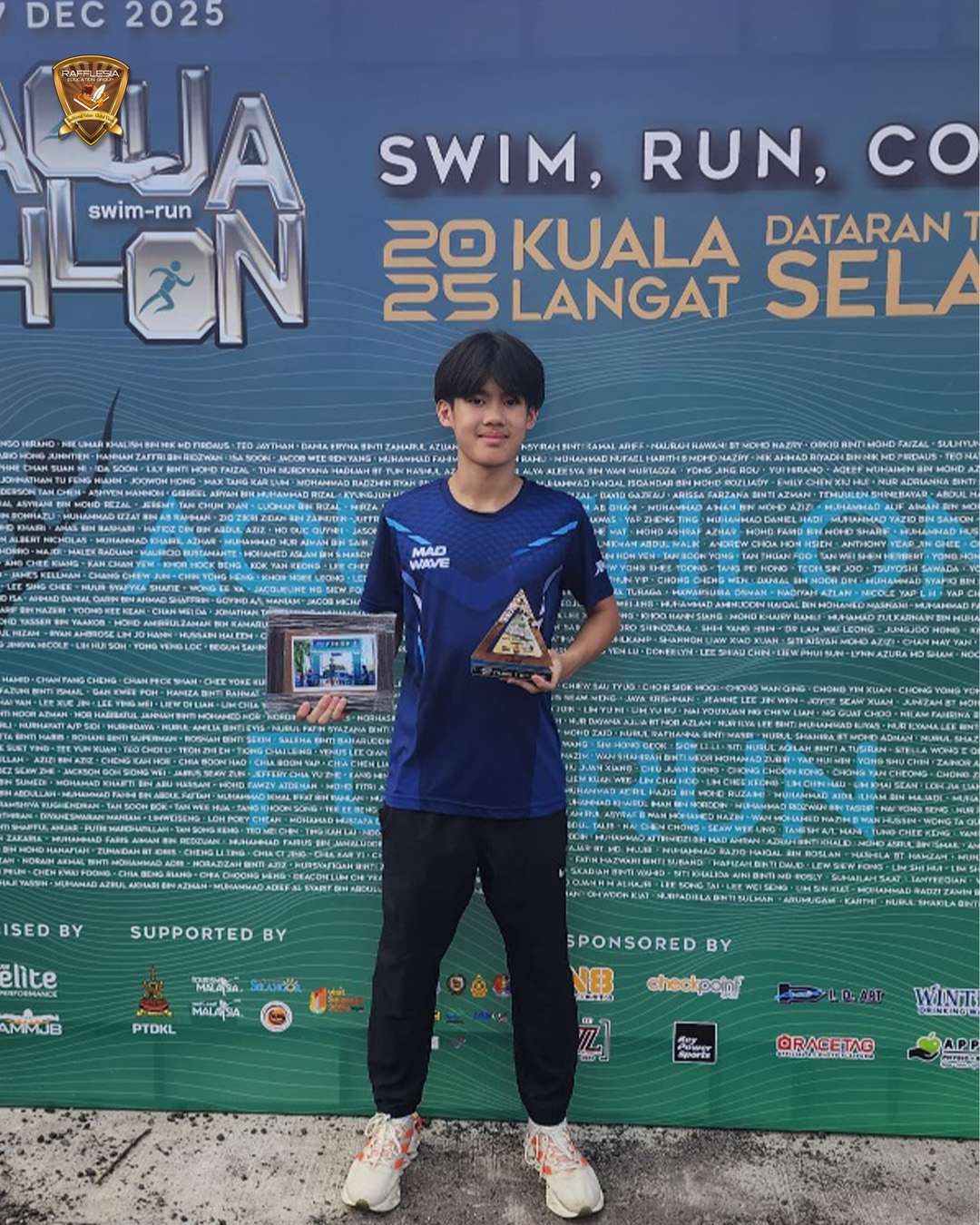Dexter Kam Yuan Zi, Form 1 Respect, Sekolah Menengah Rafflesia, secured 5th Place in the Aquathlon Event (Boys U13–U15) at Tanjung Sepat, Kuala Langat, completing a 300m open water swim and 2.5km cross-country run, and stood out as the youngest podium finisher among the participants.